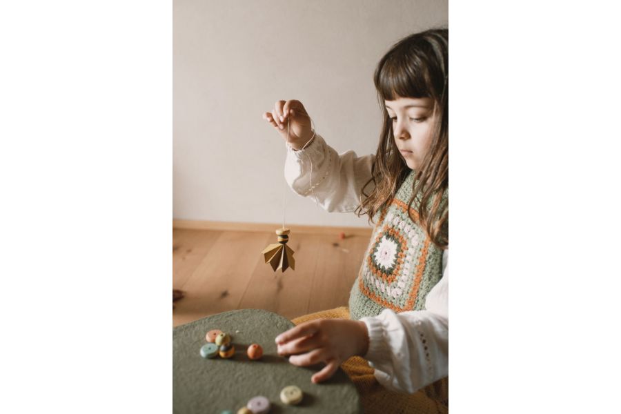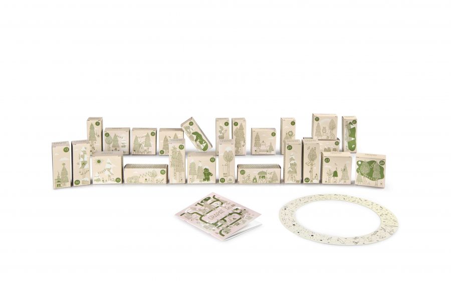 Más de 180 piezas en diferentes materiales: madera, tela, hilos, lana y mucho más. La caja también incluye un libro con invitaciones a jugar, crear y compartir tiempo juntos. Está presentado en 8 idiomas entre los que puedes elegir (cada folleto incluye 1 idioma, excepto Catalán-Español). Catalán+Español, Inglés, Alemán, Italiano, Francés, Japonés, Holandés y Chino. En la caja también encontrarás un círculo de cartón original que se puede usar como corona de Adviento, con pequeños circulitos que irás descubriendo mientras se abren las cajas numeradas día a día.