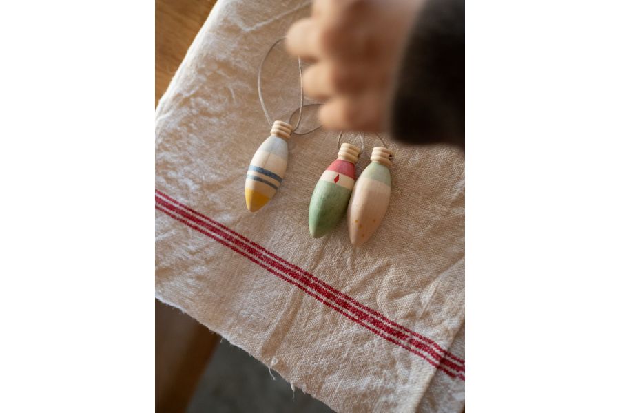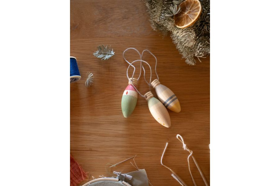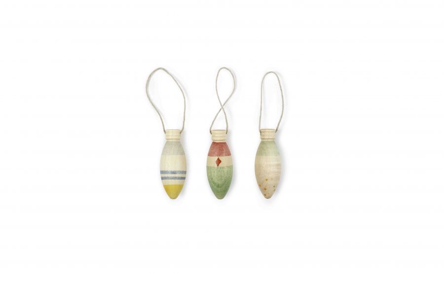 3 piezas con forma de lámpara, pintadas a mano. Incluye hilo para colgar.